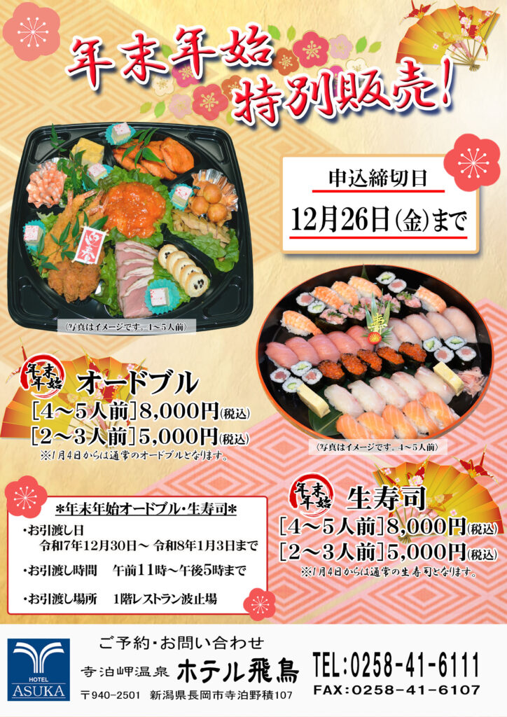 ご家族が集まる年末・年始は、当館レストラン波止場の「オードブル」と「お寿司」で、楽しくお過ごしください。
